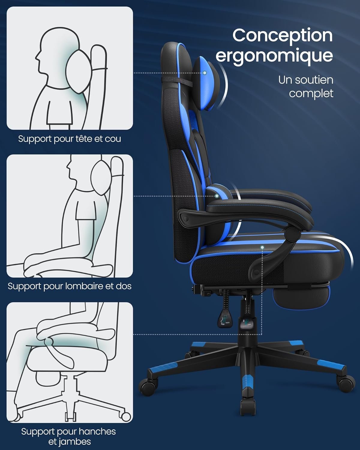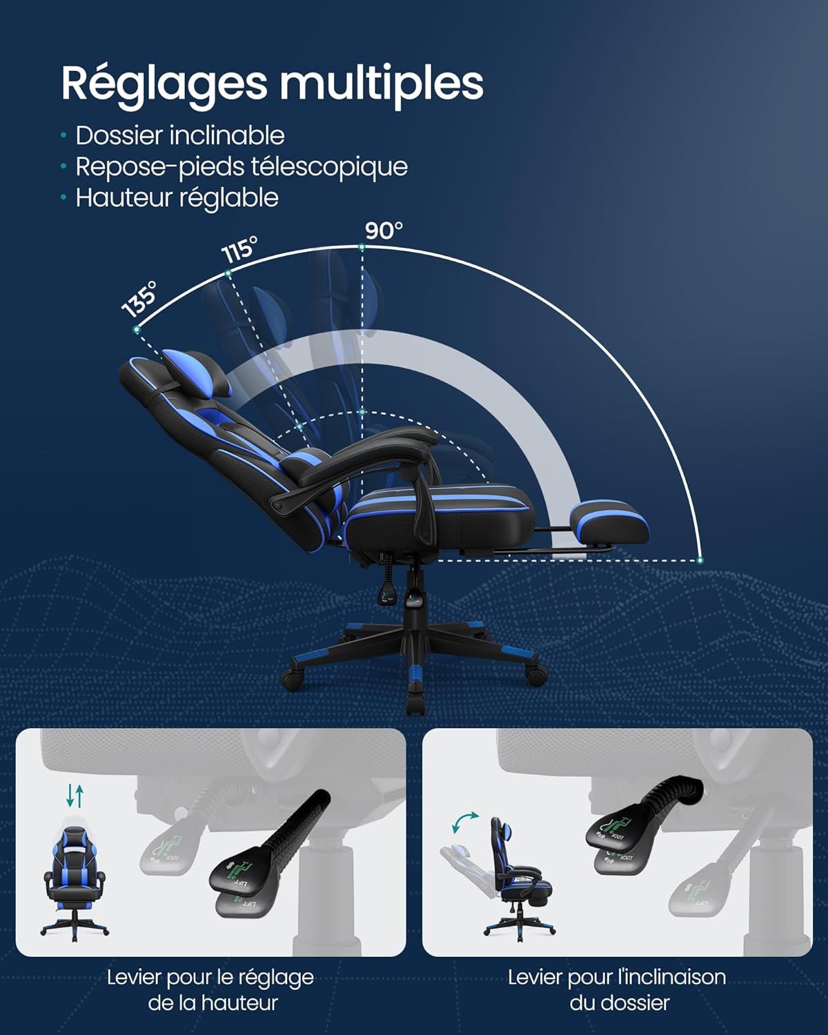 Le fauteuil de bureau ergonomique SONGMICS OBG073B04 offre un confort supérieur pour le travail ou le gaming. Doté d’un repose-pieds télescopique, d’un dossier inclinable jusqu’à 135° et d’un rembourrage épais en mousse haute densité, il assure un soutien optimal tout au long de la journée. Son design élégant et ses accoudoirs réglables combinent style et fonctionnalité. Idéal pour améliorer votre posture et votre productivité au quotidien.